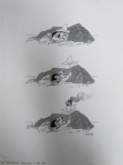 three panel cartoon artwork for Nebelspalter Switzerland Sep 1988, pen and ink, on artists paper, signed lower left, artists notes in margin, uncaptioned, Smilby yellow dot verso, together with artists rough workup for this artwork with artists notes in margin, drawn: Apr 1971, signed lower right, total paper: 376 x 279mm, paper rough: 367 x 277mm, (11).