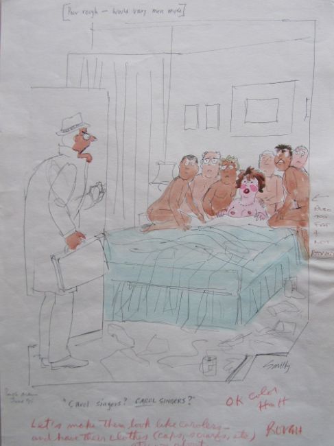 cartoon artwork for Playboy Jan 1996 pg.174, drawn: Sept 1995, pen and ink with watercolour, on Daler board, signed lower right, artists notes lower margin, caption below, Copyright Playboy All Rights Reserved stamp & Playboy Publications Inc Reproduction Prohibited Without Permission upper margin & verso, Smilby yellow dot verso, with dust sheet and cellophane wrapper, together with artists rough workup for this artwork with artists notes in margins, signed lower right, ‘Ok color HmH and further notes’ in red crayon possibly by Hugh Hefner, (2).
