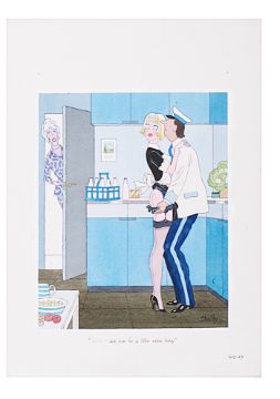 cartoon artwork, pen and ink with watercolour, on Daler board, signed lower right, captioned, artists note MD49 lower margin, with dust cover sheet, Smilby yellow dot verso, (3).