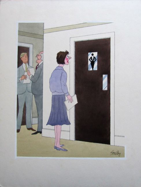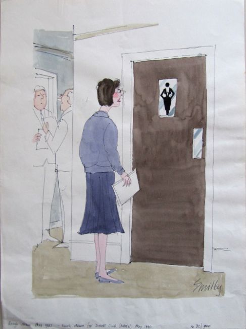 unpublished cartoon artwork for Diners Club Austria, drawn: May 1990, pen and ink with watercolour, on Daler board, signed lower right, uncaptioned, Smilby yellow dot verso, with dust sheet, together with artists rough workup for this artwork with artists notes in margins, signed lower right, (2).