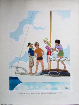 unpublished cartoon artwork for Playboy Germany, drawn: Jan 1977, pen and ink with watercolour, on Saunders board, signed right, caption below, artists notes in margins, Smilby yellow dot verso, with dust sheet.
