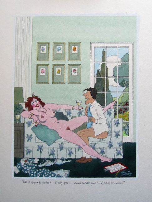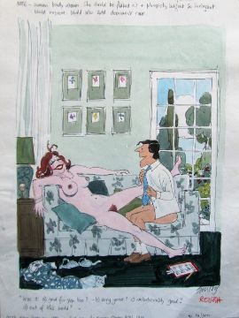 cartoon artwork for Playboy Germany Sep 1991 pg.81, drawn: Apr 1990, pen and ink with watercolour, on Daler board, signed lower right, caption below, Smilby yellow dot verso, with dust sheet, together with artists rough workup for this artwork with artists notes in margins, signed lower right, (2).