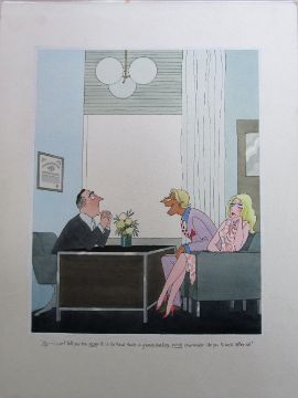 cartoon artwork for Diners Club Austria Dec 1985, drawn: May 1985, pen and ink with watercolour, on Daler board, unsigned, caption below, Smilby yellow dot verso, with dust sheet.