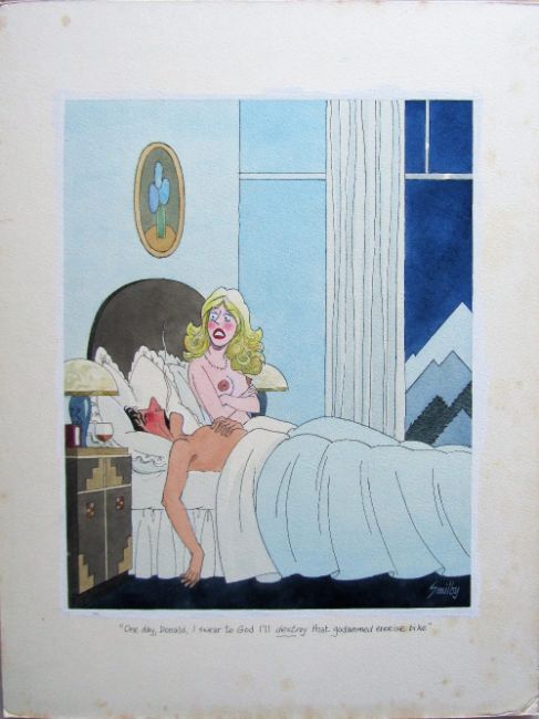 cartoon artwork for Diners Club Austria May 1987, drawn: Nov 1986, pen and ink with watercolour, on Daler board, signed lower right, caption below, Smilby yellow dot verso, with dust sheet.