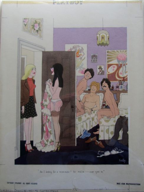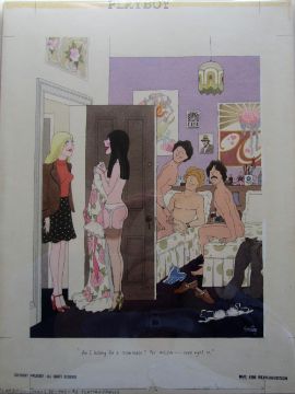 cartoon artwork for Playboy May 1975 pg.211, drawn: Nov 1974, pen and ink with watercolour, on Daler board, signed lower right, artists notes lower margin, caption below, Copyright Playboy All Rights Reserved stamp & Playboy Publications Inc Reproduction Prohibited Without Permission upper & lower margin, Smilby yellow dot verso, with dust sheet and cellophane wrapper.