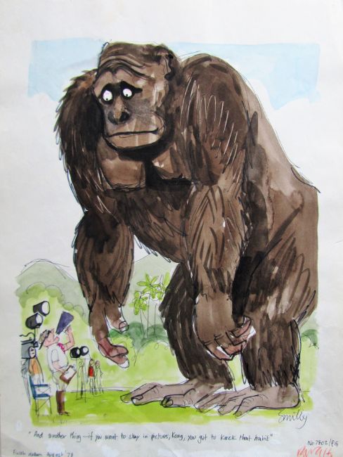 cartoon artwork for Playboy Germany, drawn: Mar 1978, pen and ink with watercolour, on Saunders board, signed right, caption below, Smilby yellow dot verso, with dust sheet, together with artists rough workup for a similar artwork with artists notes in margins, signed lower right and caption in English 'And another thing - if you want to stay in pictures, Kong, you got to knock that habit', (2).