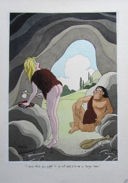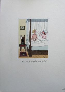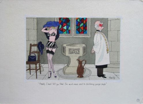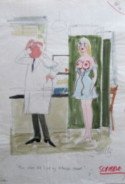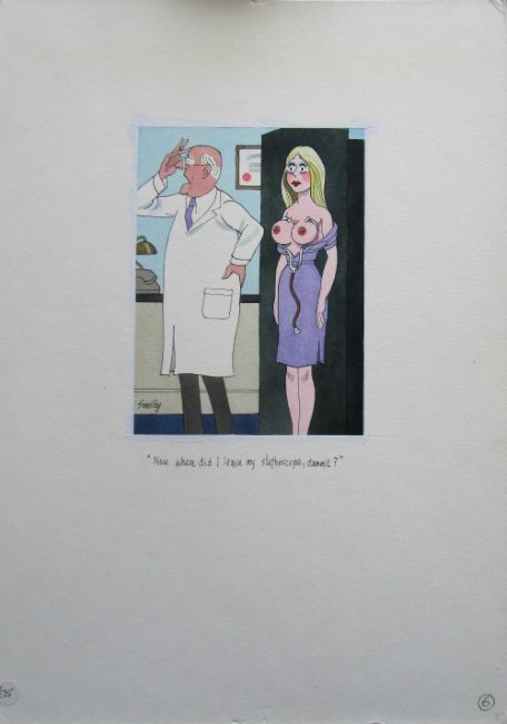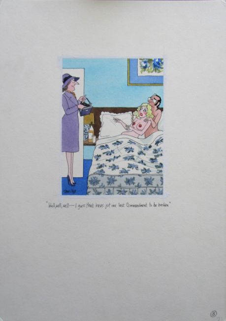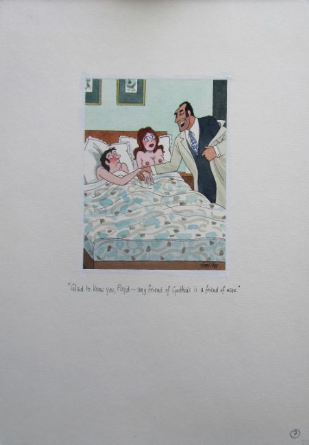 seven cartoon artworks possibly for Pardon Magazin Germany, pen and ink with watercolour, on Saunders board, signed, captions below, artists notes in margin, with dust sheets, (7).