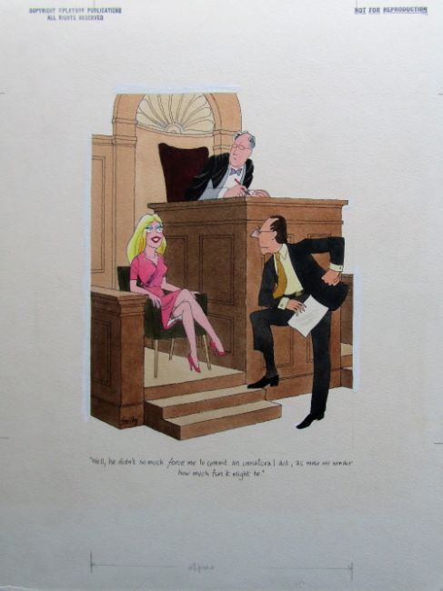 cartoon artwork for Playboy Mar 1991 pg.142, drawn: Jul 1990, pen and ink with watercolour, on Daler board, signed lower left, artists notes in margins, caption below, Copyright Playboy All Rights Reserved stamp & Playboy Publications Inc Reproduction Prohibited Without Permission upper margin & verso, Smilby yellow dot verso, with dust sheet.
