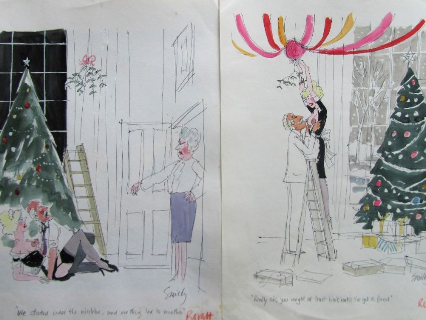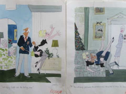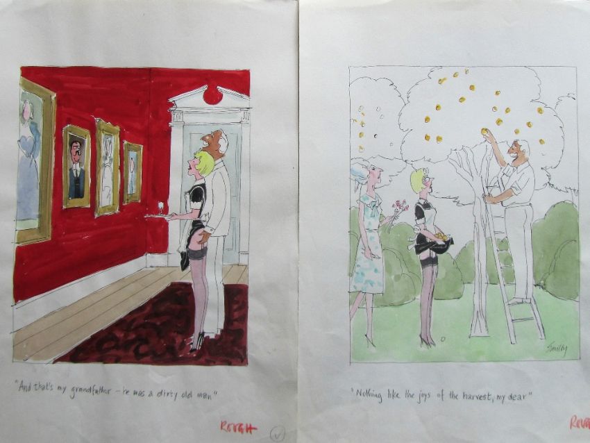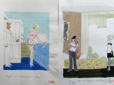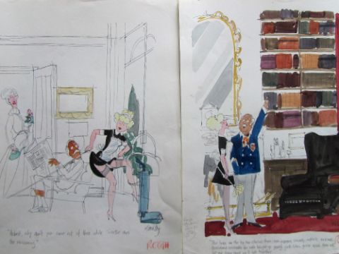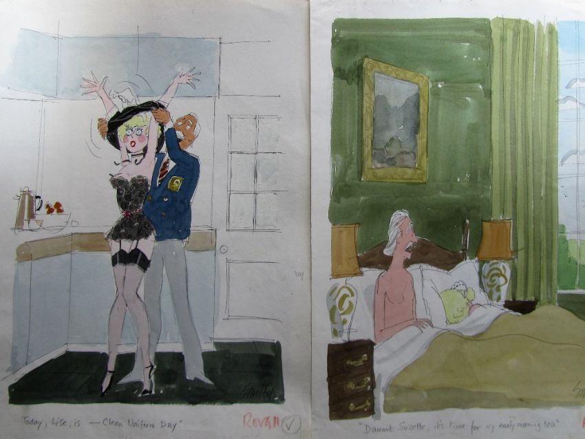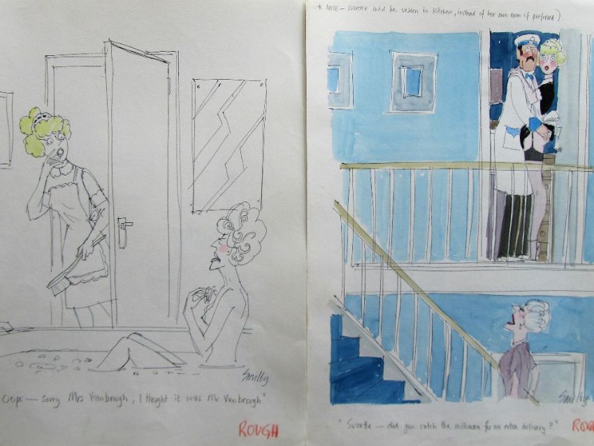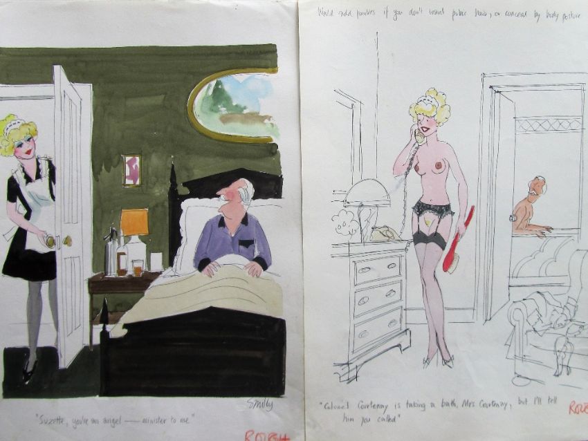 thirty six coloured 'Suzette' themed original artists rough sketches for Playboy publications, some dating from the 1960's, ink and pen with watercolour on artists paper and tracing paper, some captions below, artists notes in margins, majority signed Smilby, (36).