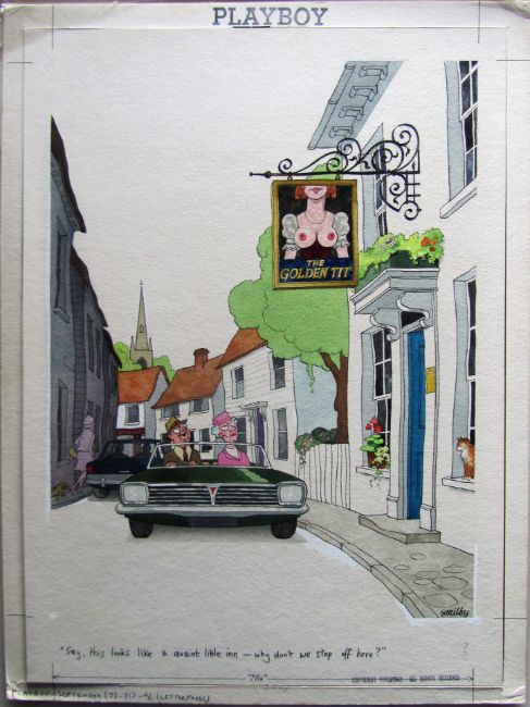 cartoon artwork for Playboy Sept 1973 pg. 184, drawn: Mar 1973, pen and ink with watercolour, on Daler board, signed lower right, artists notes in margins, caption below, Copyright Playboy All Rights Reserved stamp & Playboy Publications Inc Reproduction Prohibited Without Permission upper & lower margins & verso, Smilby yellow dot verso, with dust sheet.