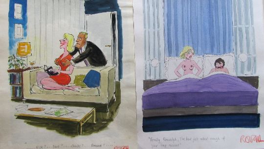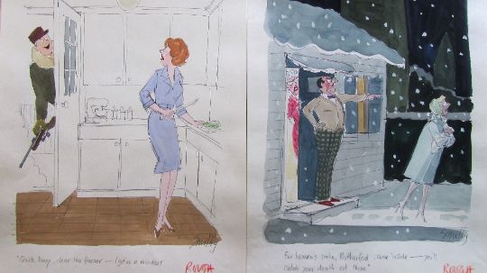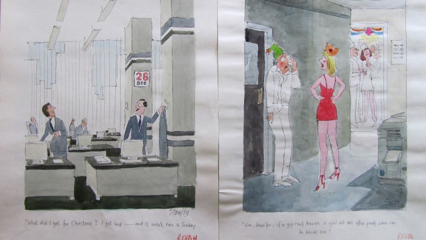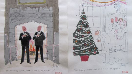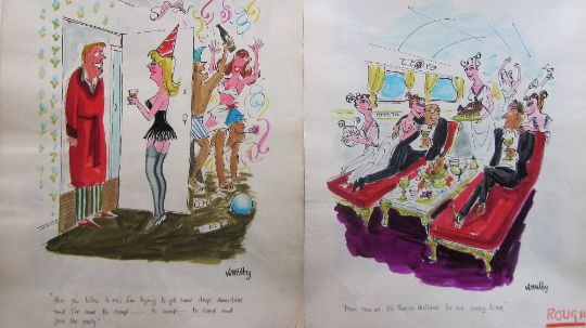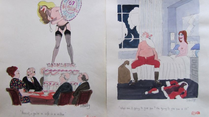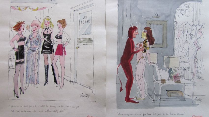 twenty-nine coloured 'Christmas Party' themed original artists rough sketches for Playboy publications, some dating from the 1960's, ink and pen with watercolour on artists paper and tracing paper, some captions below, artists notes in margins, majority signed Smilby, (29).