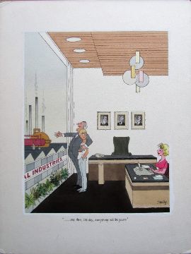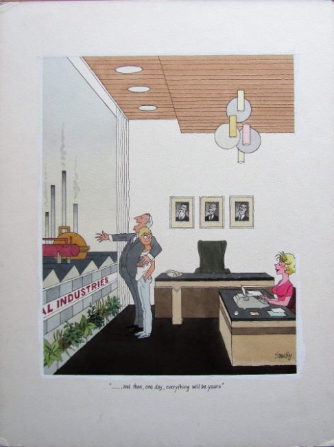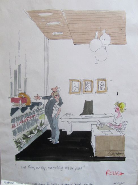 unpublished cartoon artwork for Diners Club Austria, drawn: May 1990, pen and ink with watercolour, on Daler board, signed lower right, caption below, Smilby yellow dot verso, with dust sheet, together with artists rough workup for this artwork with artists notes in margins, signed lower right, (2).
