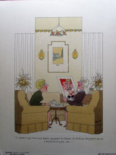 cartoon artwork for Playboy, pen and ink with watercolour, on Daler board, signed lower right, caption below, Copyright Playboy All Rights Reserved stamp & Playboy Publications Inc Reproduction Prohibited Without Permission lower margin, Smilby yellow dot verso, with dust sheet, together with artists rough workup for this artwork with artists notes in margins, signed lower right, ‘Ok color - H’ in red crayon possibly by Hugh Hefner, (2).