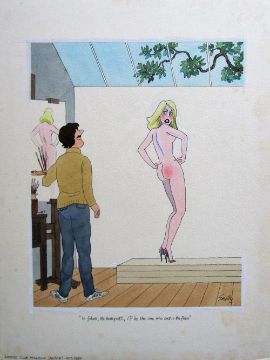 cartoon artwork for Diners Club Austria Oct 1986 pg.57, drawn: Jul 1986, pen and ink with watercolour, on Daler board, signed lower right, caption below, artists notes in margin, Smilby yellow dot verso, with dust sheet.