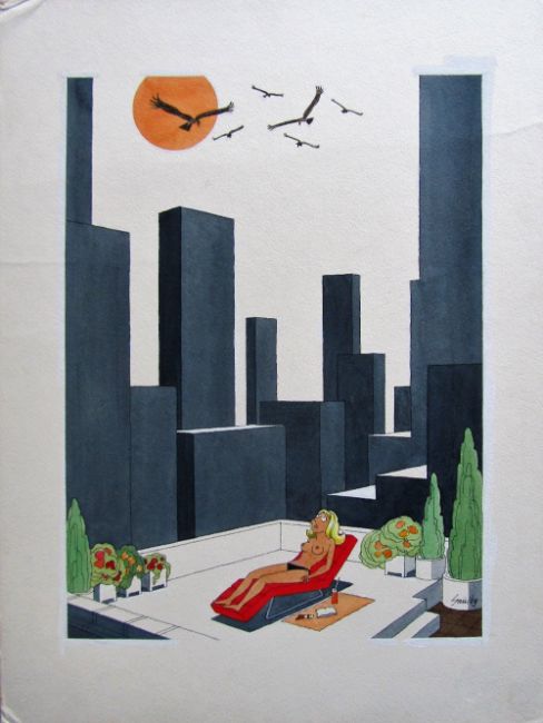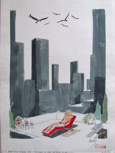 cartoon artwork for Diners Club Austria Mar 1988 pg.120, drawn: Nov 1987, pen and ink with watercolour, on Daler board, signed lower right, uncaptioned, Smilby yellow dot verso, with dust sheet, together with artists rough workup for this artwork with artists notes in margins, signed lower right, (2).