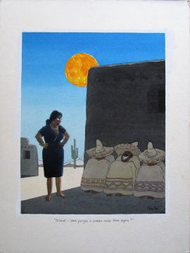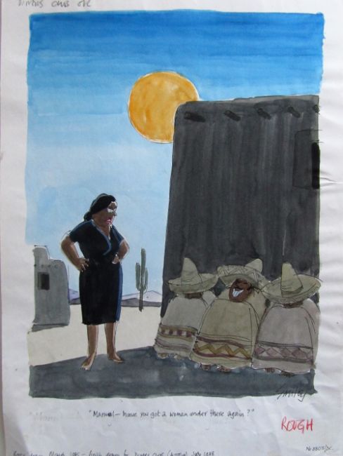 cartoon artwork for Diners Club Austria Oct 1988 pg.241, drawn: Jul 1988, pen and ink with watercolour, on Daler board, signed lower right, caption below, Smilby yellow dot verso, with dust sheet, together with artists rough workup for this artwork with artists notes in margins, signed lower right, (2).