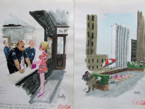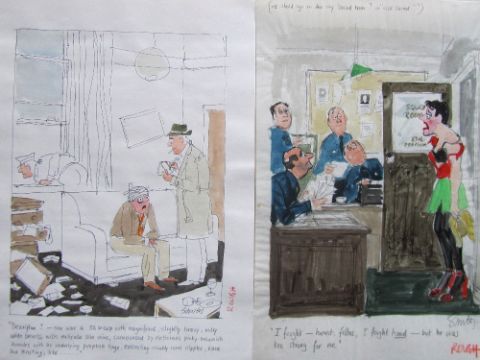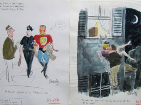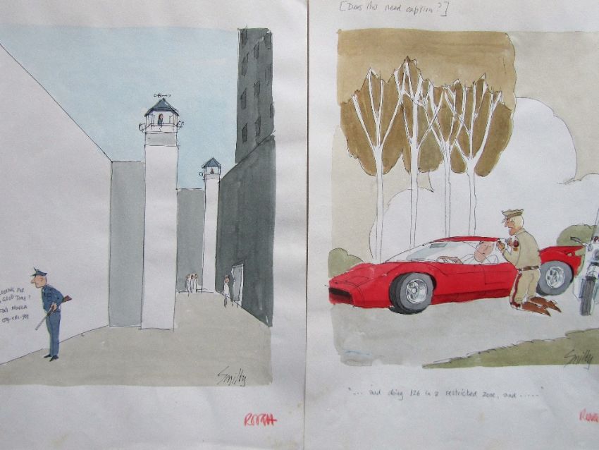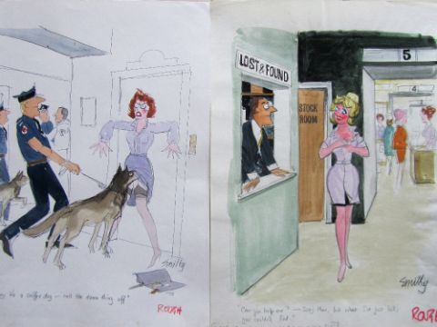 thirty coloured 'Police' themed original artists rough sketches for Playboy publications, some dating from the 1960's, ink and pen with watercolour on artists paper and tracing paper, some captions below, artists notes in margins, majority signed Smilby, (30).