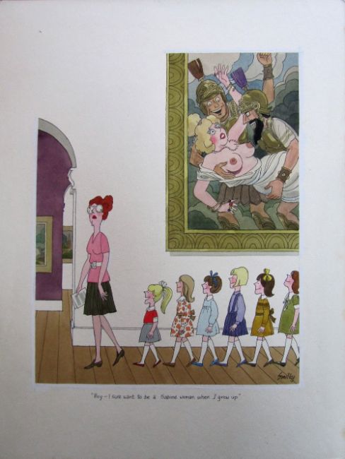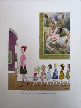 cartoon artwork for Diners Club Austria Oct 1985 pg.161, drawn: Apr 1985, pen and ink with watercolour, on Daler board, signed lower right, caption below, Smilby yellow dot verso, with dust sheet.