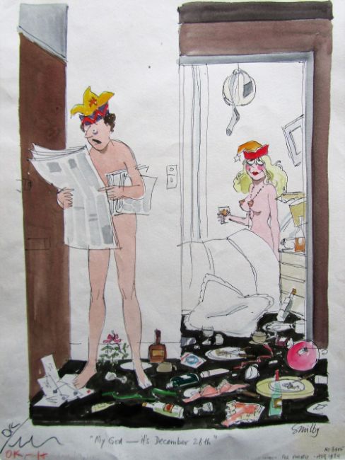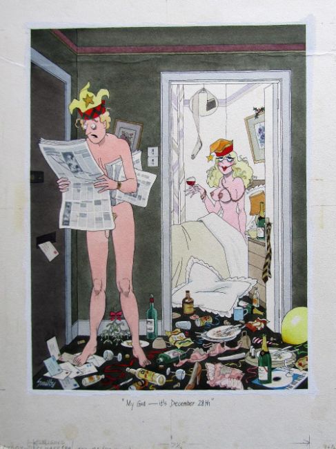 cartoon artwork for Playboy Dec 1984 pg.259, drawn: Aug 1984, pen and ink with watercolour, on Daler board, signed lower right, artists notes lower margin, caption below, Copyright Playboy All Rights Reserved stamp & Playboy Publications Inc Reproduction Prohibited Without Permission verso, Smilby yellow dot verso, with dust sheet, together with artists rough workup for this artwork with artists notes in margins, signed lower right and ‘Ok - H’ on lower margin in red crayon possibly by Hugh Hefner, (2).