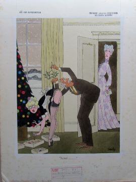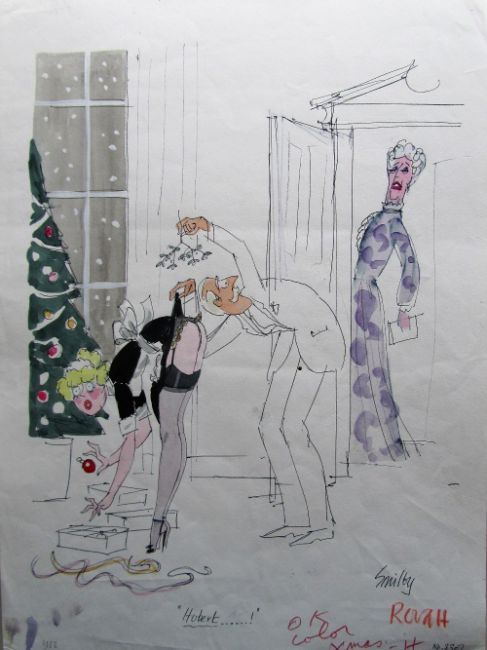 cartoon artwork for Playboy Dec 1983 pg.199, drawn: Aug 1983, pen and ink with watercolour, on Daler board, signed lower right, artists notes in margins, caption below, Copyright Playboy All Rights Reserved stamp & Playboy Publications Inc Reproduction Prohibited Without Permission upper, lower margins & verso, Smilby yellow dot verso, with cellophane and dust sheets, together with artists rough workup for this artwork with artists notes in margins, signed lower right, ‘Ok color xmas - H’ in red crayon possibly by Hugh Hefner, (2).