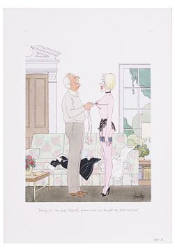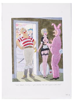 cartoon artwork, pen and ink with watercolour, on Daler board, signed lower left, captioned, artists note MD19 lower margin, with dust cover sheet, Smilby yellow dot verso, (3).