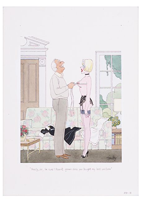 cartoon artwork, pen and ink with watercolour, on Daler board, signed lower right, captioned, artists notes and MD18 lower margin, with dust cover sheet, Smilby yellow dot verso;