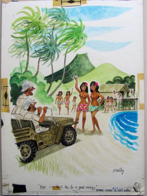 cartoon artwork for Playboy Mar 1971 pg.188, drawn: Jun 1971, pen and ink with watercolour, on Whatman board, signed right, caption below, artists notes in margins, stickers on board, Copyright Playboy All Rights Reserved stamp & Playboy Publications Inc Reproduction Prohibited Without Permission upper, lower margins & verso, Smilby yellow dot verso, with dust sheet.
