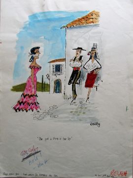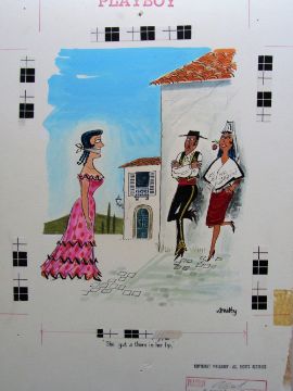 cartoon artwork for Playboy Apr 1963 pg.91, drawn: Nov 1961, pen and ink with watercolour, on Whatman board, signed lower right, artists notes in margins, caption below, Copyright Playboy All Rights Reserved stamp & Playboy Publications Inc Reproduction Prohibited Without Permission upper, lower margins & verso, stickers applied to board, Smilby yellow dot verso, together with artists rough workup for this artwork with artists notes in margins, signed lower right, ‘Ok color B &W - HmH’ in red pen and blue crayon possibly by Hugh Hefner, (2).