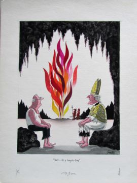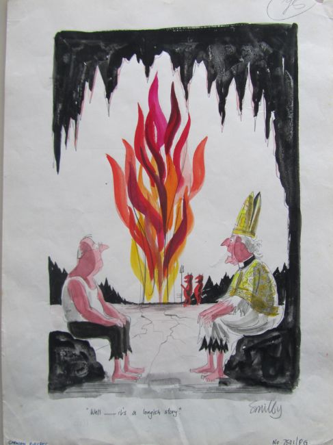 cartoon artwork for Playboy Germany, drawn: Jan 1975, pen and ink with watercolour, on Saunders board, signed right, caption below, artists notes in margins, Smilby yellow dot verso, with dust sheet, together with artists rough workup for this artwork with artists notes in margins, signed lower right, (2).