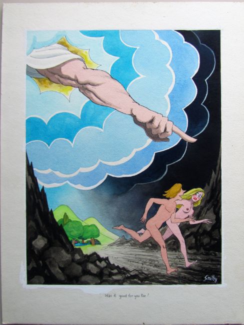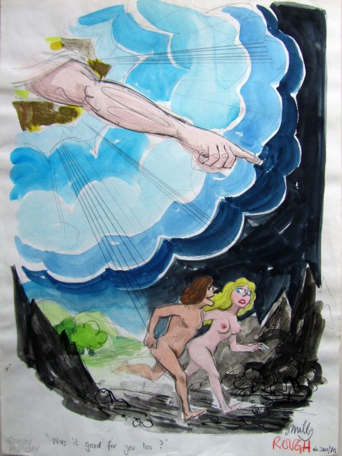 cartoon artwork for Playboy Germany, drawn: Jan 1974, pen and ink with watercolour, on Arne board, signed right, caption below, Smilby yellow dot verso, together with artists rough workup for this artwork with artists notes in margins, signed lower right, (2).