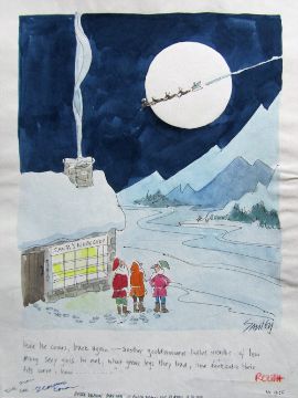 cartoon artwork for Playboy Dec 1995 pg.192, drawn: Mar 1991, pen and ink with watercolour, on Daler board, signed lower right, artists notes lower margin, caption below, Copyright Playboy All Rights Reserved stamp & Playboy Publications Inc Reproduction Prohibited Without Permission verso, Smilby yellow dot verso, with dust sheet, together with artists rough workup for this artwork with artists notes in margins, signed lower right, (2).