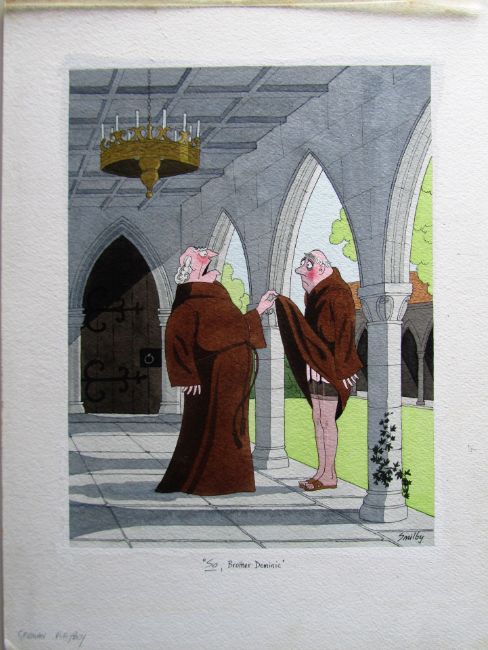 cartoon artwork for Playboy Germany, drawn: Apr 1979, pen and ink with watercolour, on Arne board, signed right, caption below, artists notes in margins, Smilby yellow dot verso, with cellophane sheet.