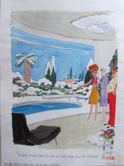 cartoon artwork for Diners Club Austria Dec 1986, drawn: Aug 1986, pen and ink with watercolour, on Daler board, signed lower right, caption below, artists notes in margin Smilby yellow dot verso, with dust sheet, together with artists rough workup for this artwork with artists notes in margins, signed lower right, (2).