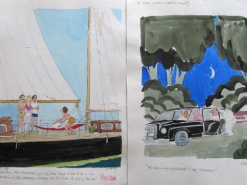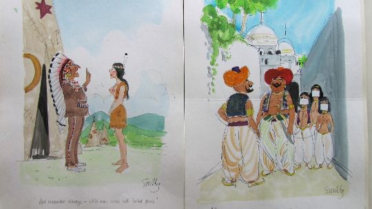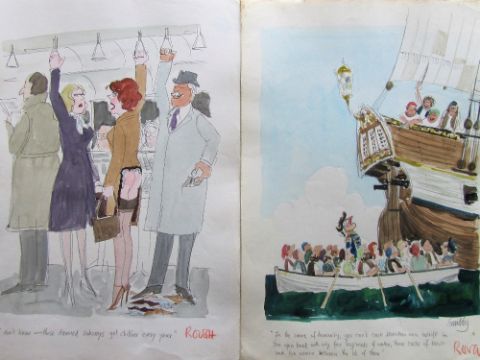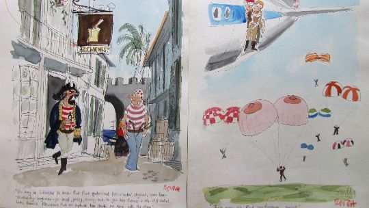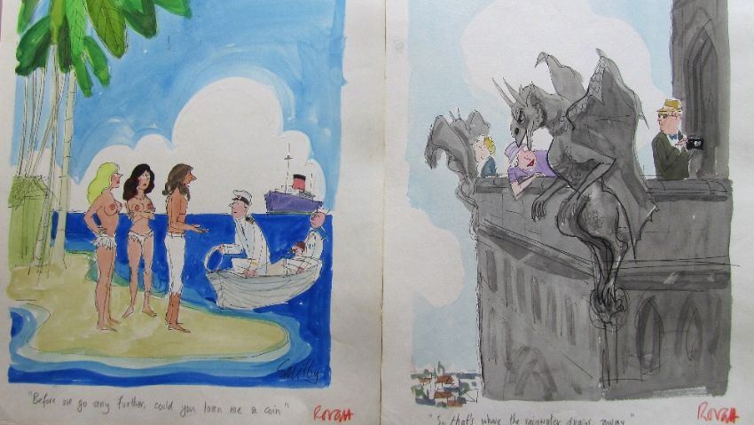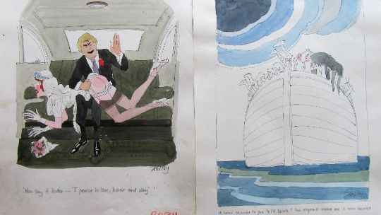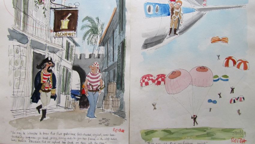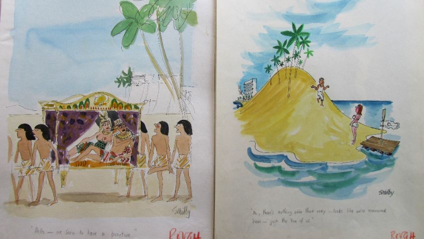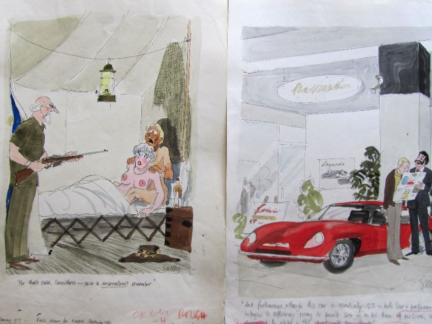 forty coloured 'Travel/Holiday/Car/Boat' themed original artists rough sketches for Playboy publications, some dating from the 1960's, ink and pen with watercolour on artists paper and tracing paper, some captions below, artists notes in margins, majority signed Smilby, (40).