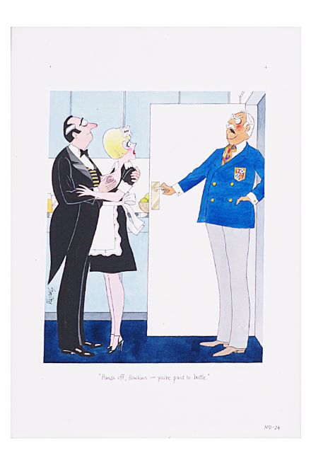 cartoon artwork, pen and ink with watercolour, on Daler board, signed lower left, captioned, artists notes and MD24 lower margin, with dust cover sheet, Smilby yellow dot verso;