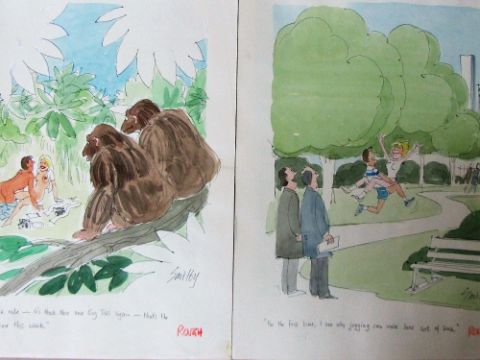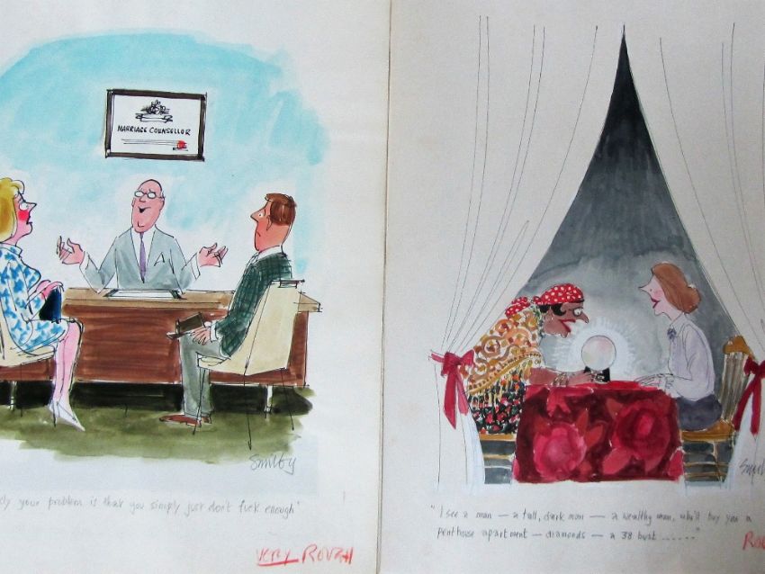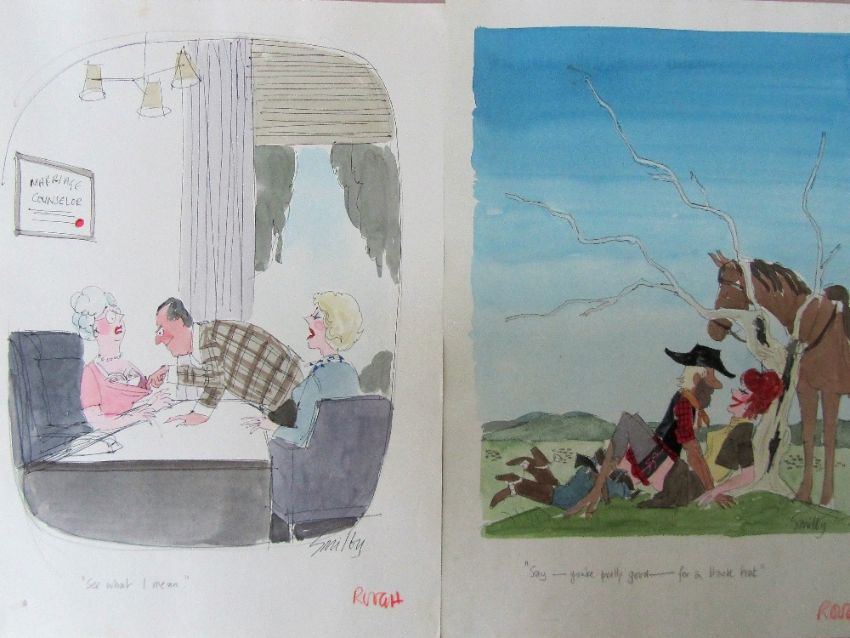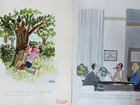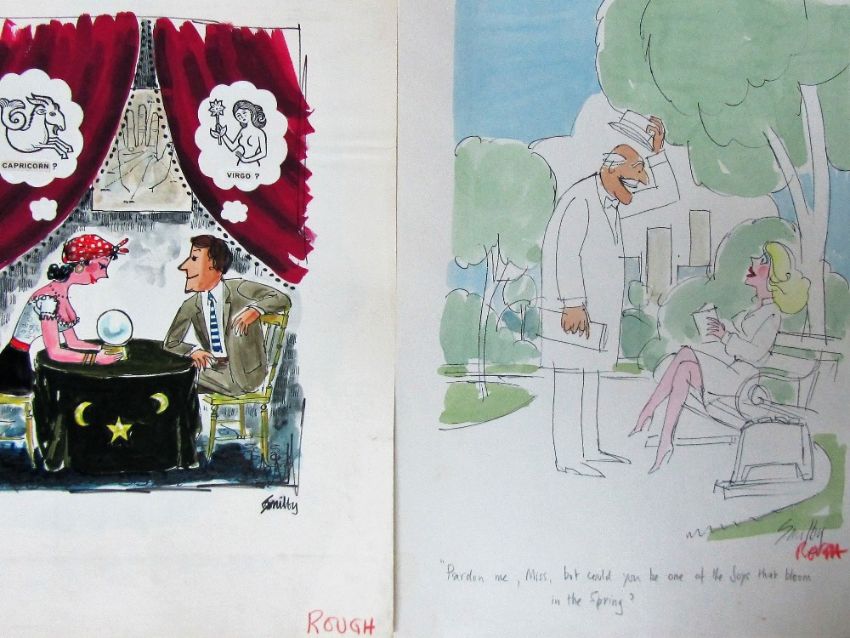 forty coloured 'Dating' themed original artists rough sketches for Playboy publications, some dating from the 1960's, ink and pen with watercolour on artists paper, some captions below, artists notes in margins, majority signed Smilby, (40).
