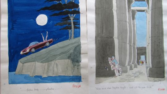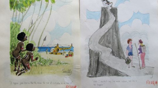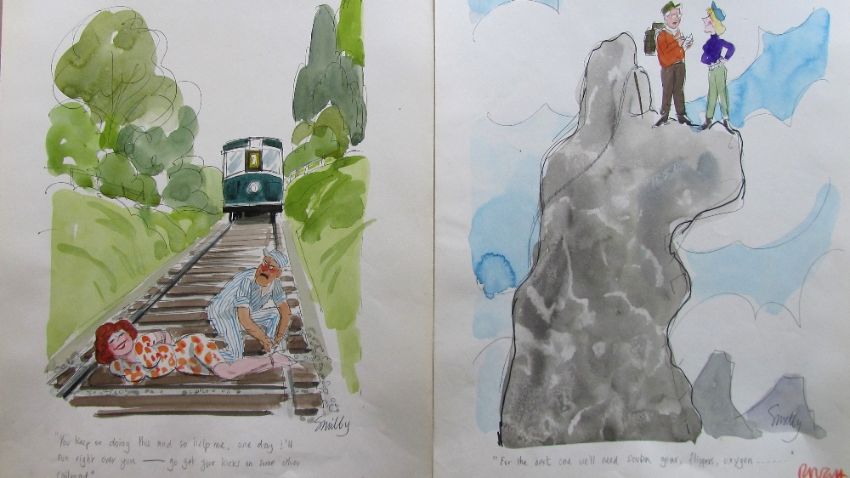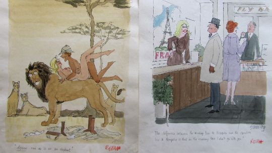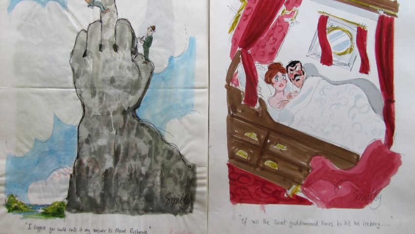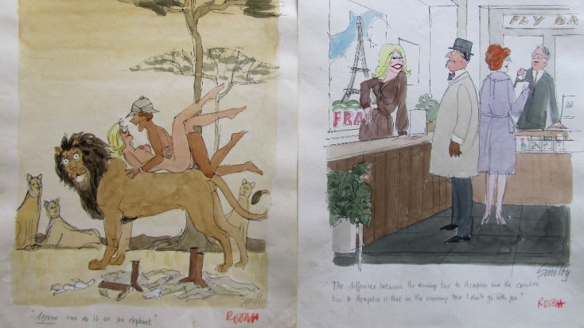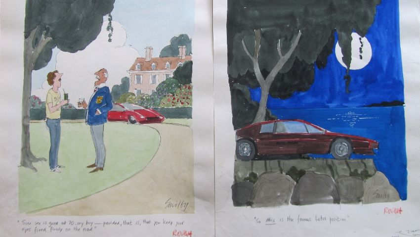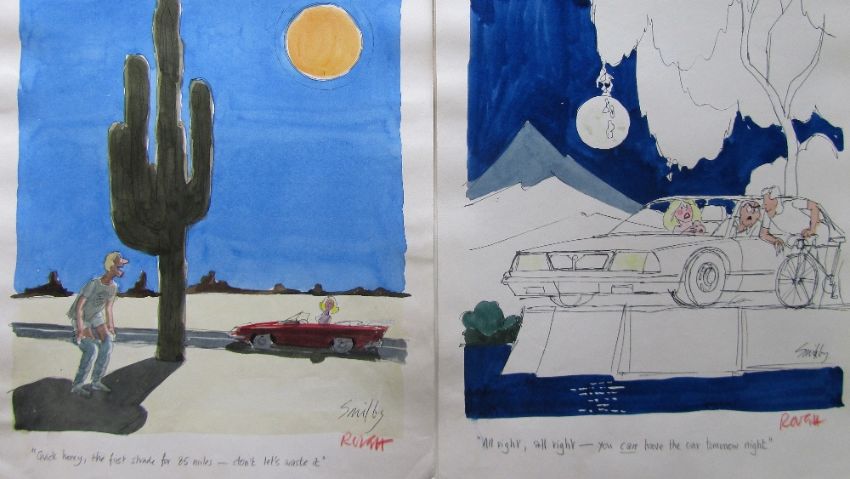 forty coloured 'Travel/Holiday/Car/Boat' themed original artists rough sketches for Playboy publications, some dating from the 1960's, ink and pen with watercolour on artists paper and tracing paper, some captions below, artists notes in margins, majority signed Smilby, (40).