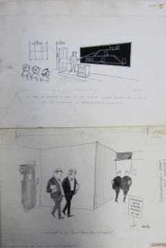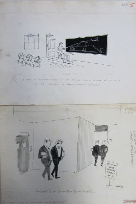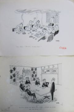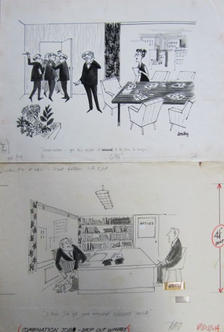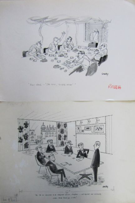 a collection ink and pen 'Industry & Business' themed original artists rough drawings and sketches for various magazines, including Punch, Playboy, each on artists paper, some signed Smilby with captions, artists notes in margins, (qty).