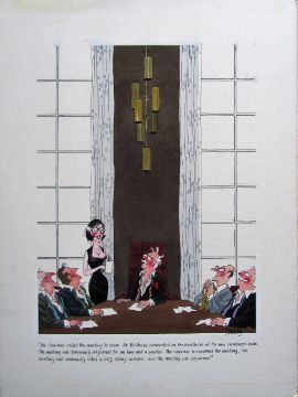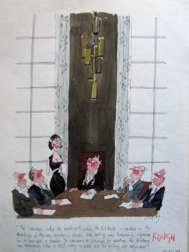 cartoon artwork for Playboy Germany Mar 1985 pg.71, drawn: Jan 1983, pen and ink with watercolour, on Daler board, signed lower right, caption below, Smilby yellow dot verso, with dust sheet, together with artists rough workup for this artwork with artists notes in margins, signed lower right, (2).