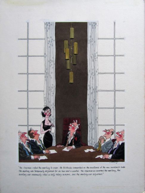 'The chairman called the meeting to order. Mr. Bulstrode commented on the excellence of the new secretary’s boobs. The meeting was temporarily adjourned for an hour and a quarter. The chairman re-convened the meeting, the secretary was unanimously voted a 100 & salary increase, and the meeting was adjourned'