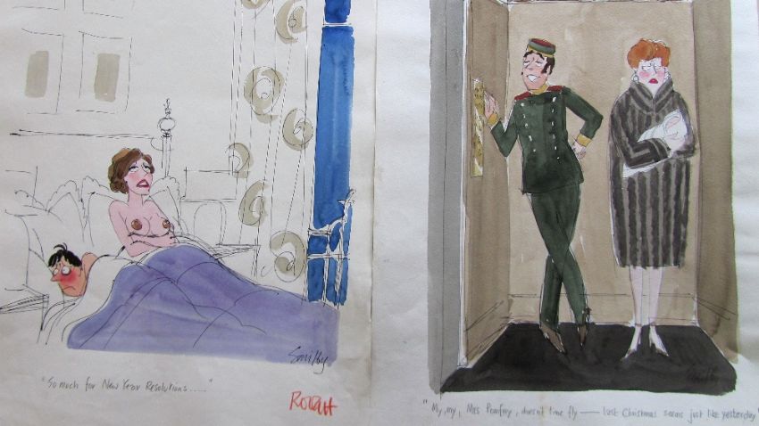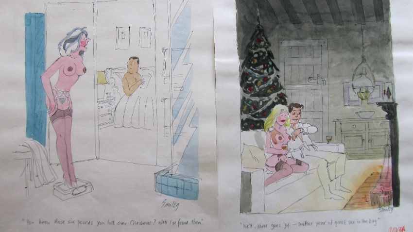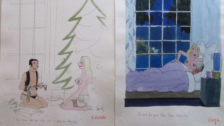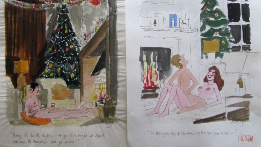 twenty-eight coloured 'Christmas Party' themed original artists rough sketches for Playboy publications, some dating from the 1960's, ink and pen with watercolour on artists paper and tracing paper, some captions below, artists notes in margins, majority signed Smilby, (28).