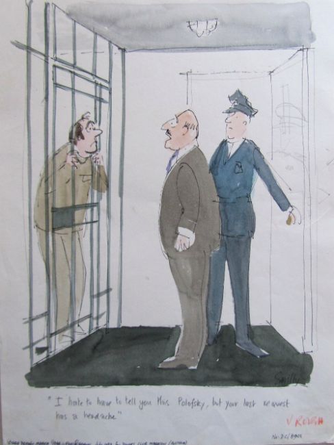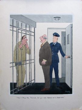 cartoon artwork for Diners Club Austria Oct 1989 pg.328, drawn: Aug 1989, pen and ink with watercolour, on Daler board, signed lower right, caption below, Smilby yellow dot verso, with dust sheet, together with artists rough workup for this artwork with artists notes in margins, signed lower right, (2).