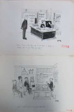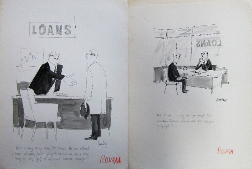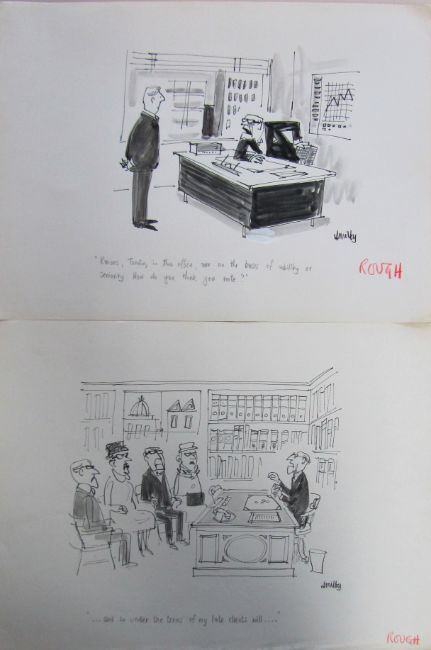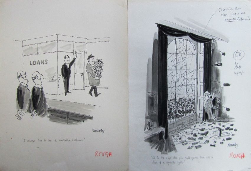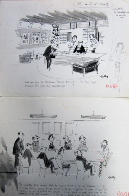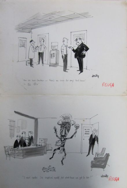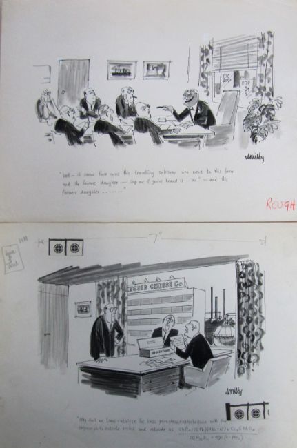 a collection ink and pen 'Boardroom, Business' themed original artists rough drawings and sketches for various magazines, including Punch, Playboy, each on artists paper, some signed Smilby with captions, artists notes in margins, (qty).