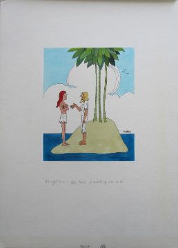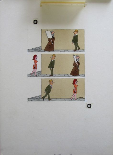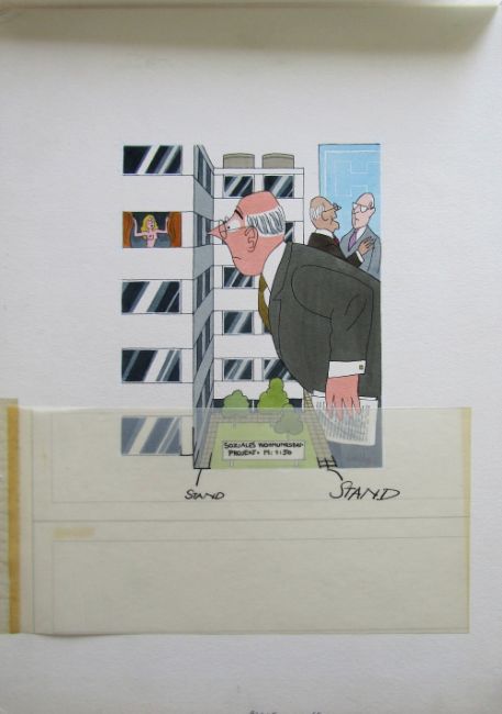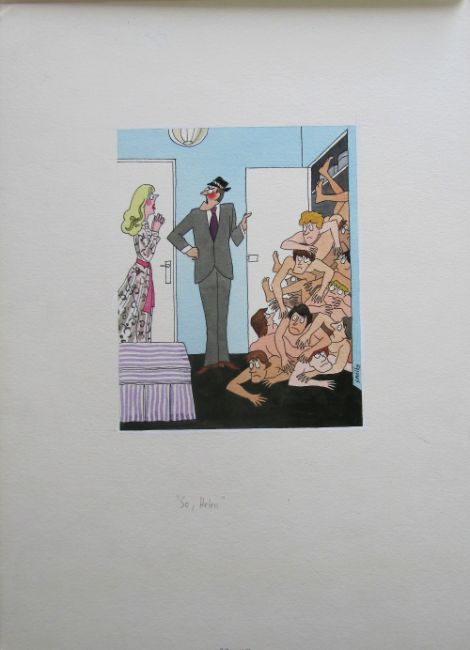 six cartoon artworks possibly for Pardon Magazin Germany, pen and ink with watercolour, on Milburn board, signed right, some with pencil captions below, others with captions typed in German on paper strips, artists notes in margin, with dust sheets, (6).