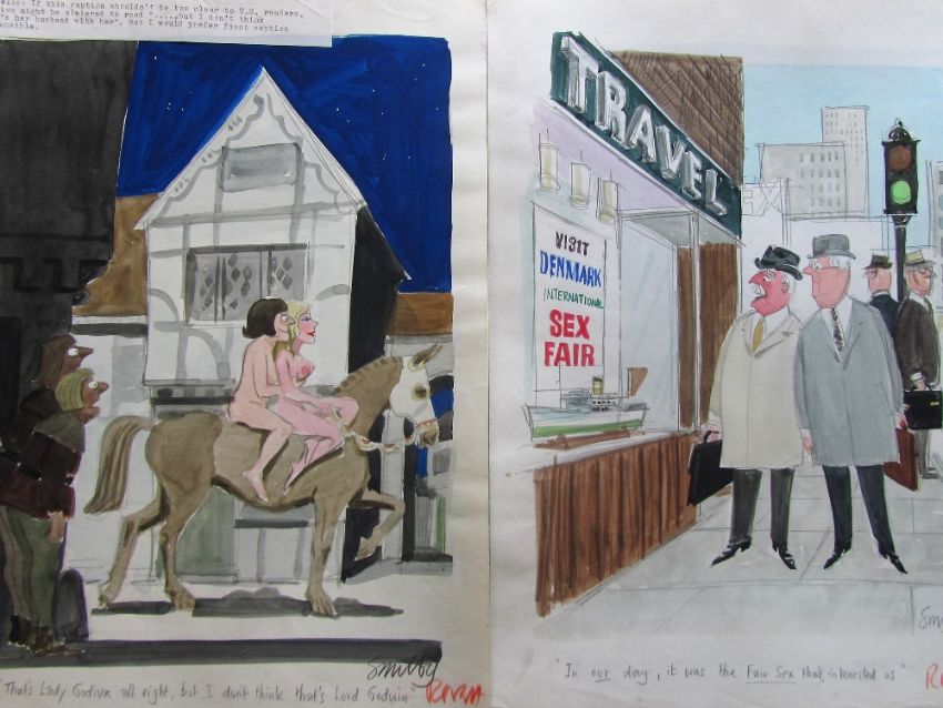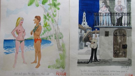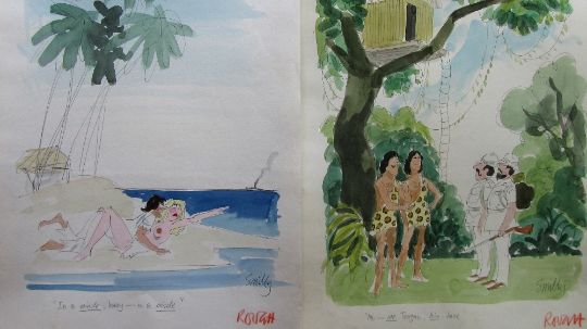 forty coloured 'Travel/Holiday/Car/Boat' themed original artists rough sketches for Playboy publications, some dating from the 1960's, ink and pen with watercolour on artists paper and tracing paper, some captions below, artists notes in margins, majority signed Smilby, (40).