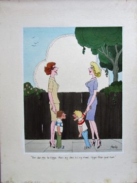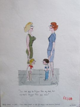 cartoon artwork for Diners Club Austria Nov 1989 pg.160, drawn: Mar 1987, pen and ink with watercolour, on Daler board, signed lower right, caption below, artists notes in margin, Smilby yellow dot verso, with dust sheet, together with artists rough workup for this artwork with artists notes in margins, signed lower right, (2).