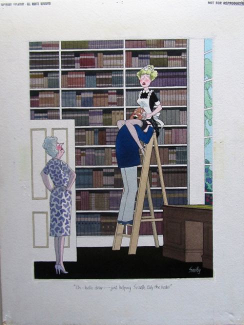 cartoon artwork for Playboy Oct 1983 pg.203, drawn: Apr 1979, pen and ink with watercolour, on Arne board, signed lower right, artists notes in margins, caption below, Copyright Playboy All Rights Reserved stamp & Playboy Publications Inc Reproduction Prohibited Without Permission upper margin & verso, Smilby yellow dot verso, with dust sheet.