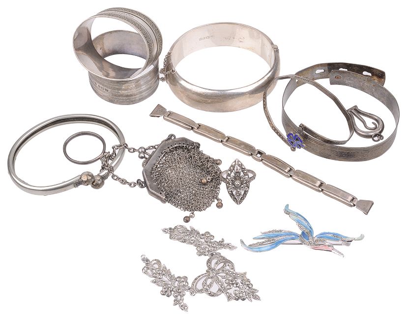 to include a silver 'double ballerina' brooch, a silver and marcasite marquis ring, a miniature silver button and other charms and chains, silver watch bracelet, three silver bangles (a.f.), a small mother of pearl and silver penknife, silver serviette ring, silver scroll engraved bangle, small white metal mesh purse and several other items (Q)