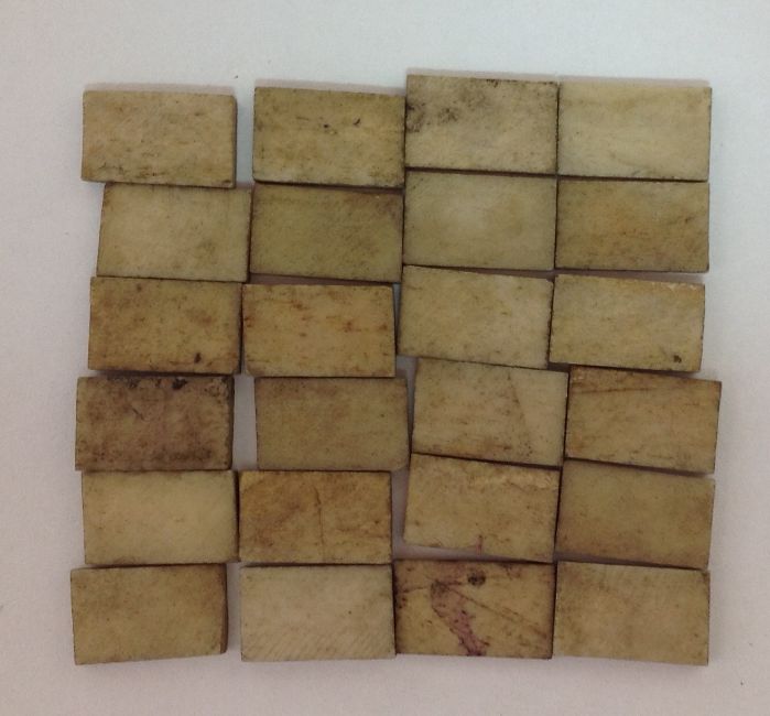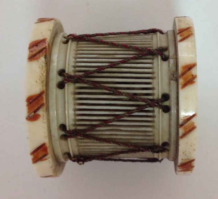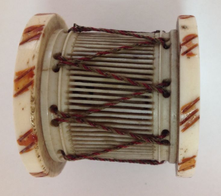 the bone drum with fretted sides and thread detail, with 24 miniature tiles