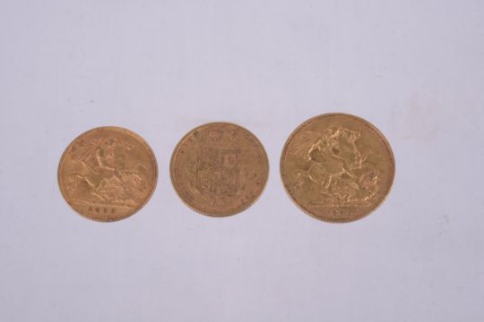 Jubilee head of Queen Victoria facing left with St George slaying the dragon reverse, together with a Queen Victoria 1885 gold half sovereign, young head of Queen Victoria facing left with crowned shield reverse and a Edward VII 1909 gold half sovereign, head facing right with St George slaying the dragon reverse, (3).